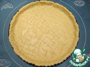 Я использую круглую форму диаметром 29 см с поднимающимся дном (если Ваша форма значительно меньше моей в диаметре - пропорционально уменьшите количество ингредиентов для теста). Выравниваю тесто, равномерно распределяя по всей форме, вилкой делаю проколы по дну пирога. Можно при выпечке на некоторое время пирог застелить фольгой, насыпать фасоль, а затем уже убрать, чтобы пирог успел пропечься. Выпекаю основу в разогретой до 180 градусов духовке около 20 минут (как на мой вкус, то я бы выпекала еще минуты 3-4, но, возможно, это особенность моей духовки).