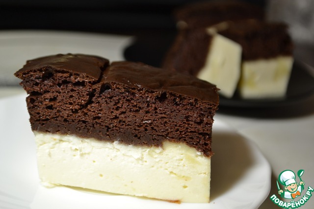 На творожную массу равномерно выложить шоколадное тесто, разровнять лопаткой. Выпекать в предварительно разогретой до 200С духовке около 20 минут.