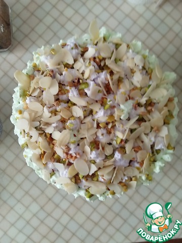 Украсить сливками из кондитерского мешка, и карамелизованными апельсинами. Бока и верх присыпать рубленными фисташками (миндалем).