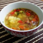 Когда вода закипит, закладываем в неё овощи, добавляем овощную приправу, укроп и варим до готовности.