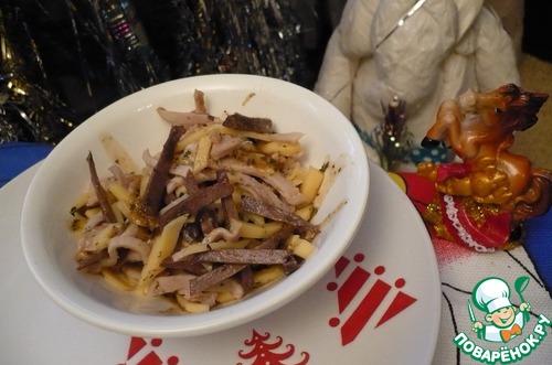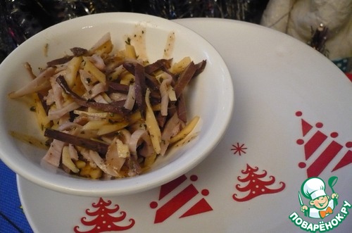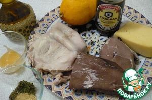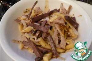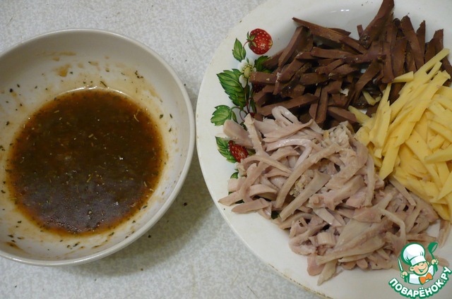 Сердце, желудок и сыр режем некрупной соломкой (можно средним кубиком). Теперь соус. Если мед у вас загустел, то ставим его примерно на 20 сек. в микроволновку до жидкого состояния. Добавляем соевый соус, горчицу, сок, растительное масло, специи и тертый чеснок. Все взбиваем вилкой до загустения.