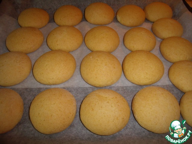 Разложить на противень и приплюснуть каждый до 1 см толщиной.