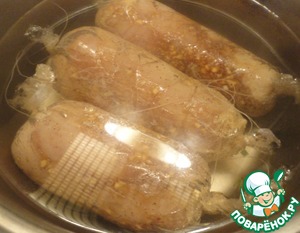 Заворачиваем куриный рулет в пленку. Обматываем в два-три слоя оной. С двух сторон завязываем пленку узлами и, для надежности, приматываем нитками. Получаются такие себе "конфетки".