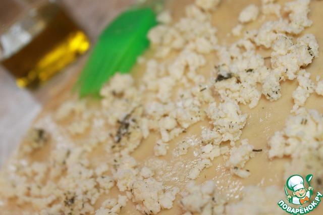 Тесто разделите на части, раскатайте в круги. Смажьте маслом и посыпьте брынзой