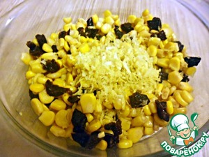 С кукурузы сливаем воду, в чашке смешиваем чернослив, кукурузу и цедру примерно с половины лимона.