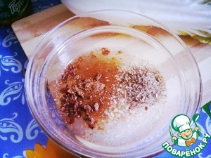 Смешать бульон, специи (чеснок желательно свежий, у меня не оказалось), горчицу. Вместо соли я пробовала лить соевый соус, это даже полезнее. Но его так же не оказалось под рукой.
