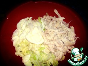 Нарезать капусты нужное кол-во, порезать белки (я режу белок напополам и поперек, выходят длинные кусочки).