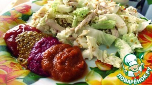 Горчица французкая, хрен со свеклой, кабачковая икра, кетчуп - по ч. л. так, для украшения. Уж очень люблю такие вещи :) (В учет по ккал и б/ж/у не включены)