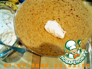 Переложила в сковородку. Аккуратно придавливая ложкой, придать форму купола. Кладем крем (немного оставьте на обмазку коржа) раскладываем нарезанные ломтики банана.