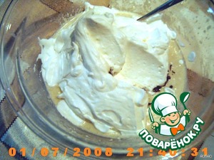 Ввести в желтковую массу взбитые белки, всыпать муку, какао-порошок, разрыхлитель, замесить тесто.