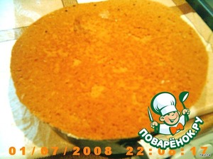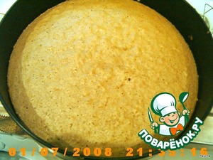Остывший корж разрезаем. Верхнюю часть коржа положить в миску для салата. У меня не было подходящей посуды.