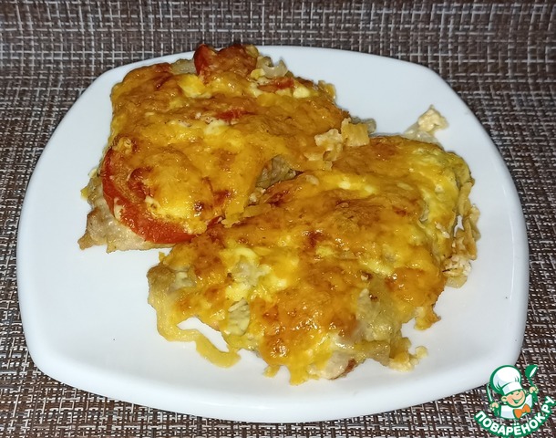 Отбитые кусочки мяса посолить и выложить на смазанный маслом противень и на каждый кусочек сверху положить лук, нарезанный кольцами (при желании можно положить грибочки и помидоры, нарезанные кольцами), полить майонезом и сверху посыпать натертым на крупной терке сыром.