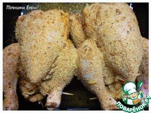 Наливаем в противень немного воды, примерно с палец, и осторожно укладываем цыплят. Присыпаем их густо панировочными сухарями и отправляем в духовку на 35-40 минут при 170 градусах.