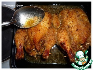 За 10 минут достаем и поливаем наших цыплят подливой (вода+сок, выделяемый цыплятами). И отправляем обратно.