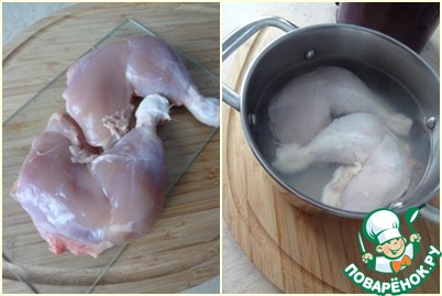 С куриных окорочков снять шкурку. Поместить в кастрюлю, залить кипящей водой так, чтобы чуть покрывала мясо. Варить в течение получаса.