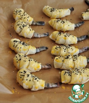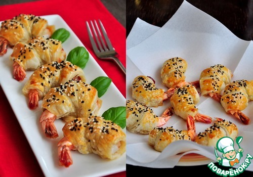 Тесто разморозить, раскатать, чуть присыпав мукой, нарезать тонкими полосками. Замотать креветку с пармой в полоску теста.