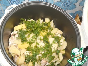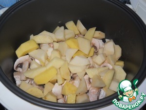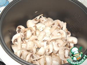Затем выключаем мультиварку. Режем на 4 части мытые грибы и насыпаем на лук и чеснок