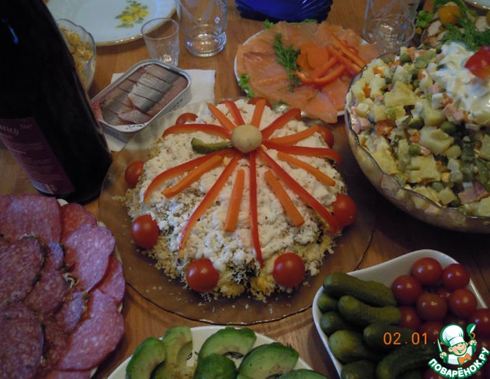 Праздничный, очень интересный по вкусу салат. Этот салат рекомендуется готовить вечером перед торжеством. Чтобы за ночь, проведенную в холодильнике, он пропитался от и до. Гости были в восторге от салата, и это после 31-1 января, когда на салаты уже смотреть не хочется. Всем приятного аппетита!