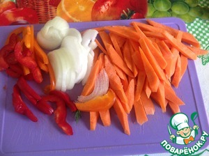 Морковь нарезать соломкой или наискосок. Перец полосками, лук полукольцами, и отправляем в чашу мультиварки обжариваться с 1 ст. л. оливкового масла, слегка посолить овощи. После этого закладываем к овощам замаринованную грудку, ставим режим ТУШИТЬ на 20-25 мин при закрытой крышке.
