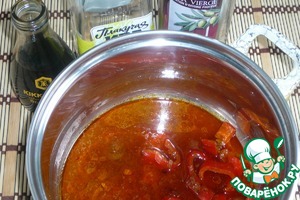 Сцеживаем рыбный бульон, добавляем в него нашу "зажарку", 2 ст. л. соевого соуса, 1 ст. л. водки и 1 ст. л. оливкового масла. Ставим обратно на газ, провариваем не более 10 минут. Затем опять сцеживаем. Ничего не выбрасываем. Все, бульон пока можно отставить в сторону.