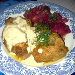 Поскольку тратить такой лук на соус в моей семье - кощунство, то соус я делаю другой. Смешать в равных частях майонез, сметану, мелко порезанный лук и каперсы. Можно добавить немного сливок. Дать настояться.