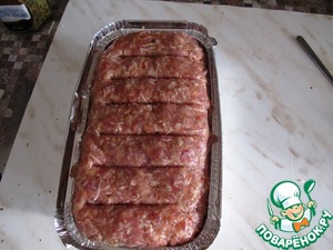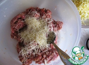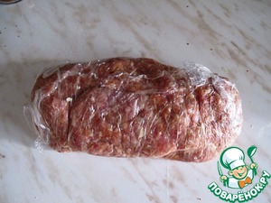Расстелите на столе кусок пищевой пленки и распределите на нем равномерно фарш. Сверху посыпьте его тертым чеддером со специями. С помощью пленки аккуратно скрутите фарш в рулет,