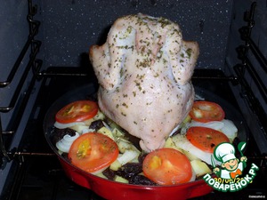 Жареная курочка (целиком) с печеным картофелем и черносливом.