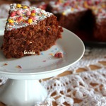 50 гр сливочного масла, 50 мл молока и плитку черного шоколада растопить на огне и полить им пирог. Тогда это получается двойное шоколадное удовольствие. У меня, честно, не было времени, гости уже сидели на кухне)), поэтому я украсила сахарной пудрой с корицей и кондитерским бисером.