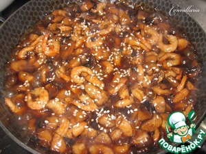 Креветки с грибами вместе с маринадом потушить на сковороде в течение 5 минут. Маринад должен загустеть.