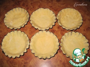 Раскатать тесто в тонкий пласт (0,5 см.), вырезать кружки, поместить в формочки для тарталеток. Тесто плотно прижать, чтобы оно хорошо покрывало дно и бока, подравнять края.