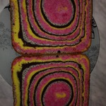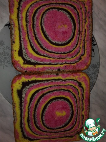 • Духовку заранее разогрейте до 180 градусов. Форму для выпечки застелите пергаментом, смажьте маслом. В центр формы поочередно выкладывайте по 2 ст. л. теста: желтого, коричневого, макового, розового и так до конца. Затем форму слегка стукните 2 раза по столу, чтобы тесто равномерно распределилось. Печь 40-45 мин. (ориентируйтесь по своей духовке!)