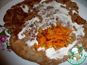 Горячий блин можно смазать майонезом (кому как по вкусу)