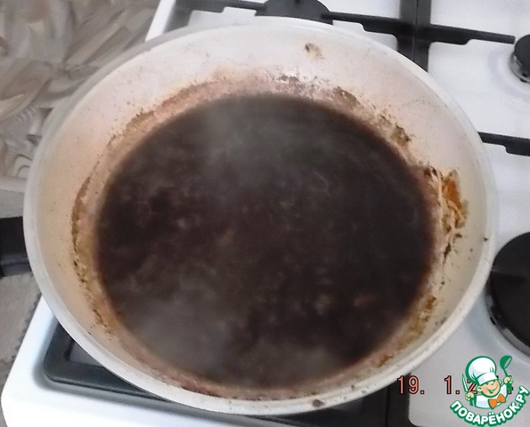 На сковороду, где жарили мясо, вылить вино и дать ему покипеть 3 минуты. Затем перелить вино в мясо.