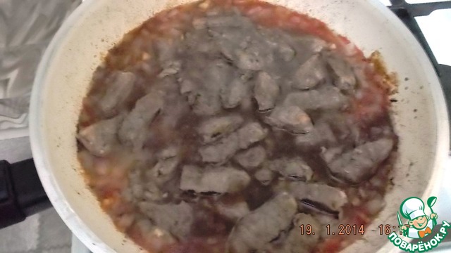 Мясо с вином выложить на луково-томатную смесь, перемешать и тушить на медленном огне 70 мин. Если в процессе тушения будет маловато жидкости, добавьте немного воды.