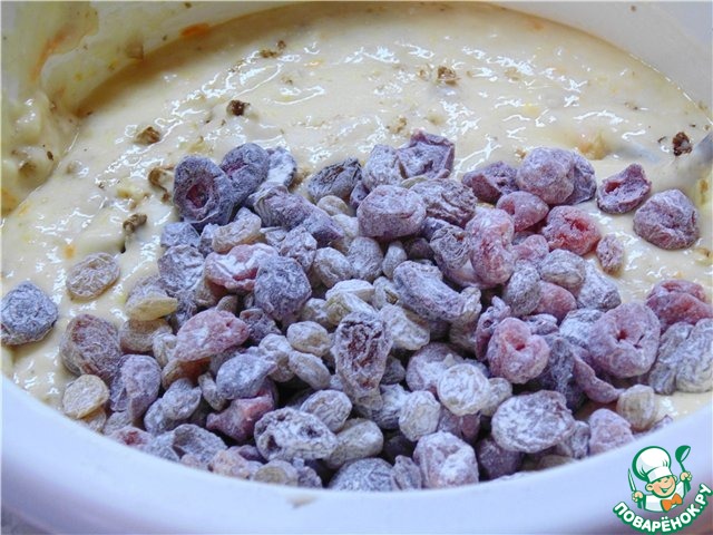 В последнюю очередь добавить обвалянные в муке сухофрукты и хорошо перемешать тесто.