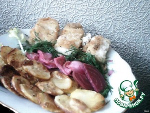 На противeнь укладываем резаную и мытую картошечку, резаный сельдерей и нашу рыбку. Запекаем минут 30 при температуре 200 градусов. Подаем рыбку с картошкой запеченной и с капустой маринованной. Приятного аппетита.