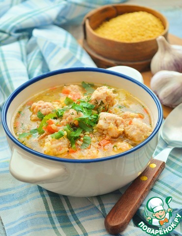Через 10 минут добавить в суп картофель и фрикадельки, лавровый лист, посолить. Я еще положила приправу для супов (она без соли, только одни травы. Вот состав: перец черный молотый, лавровый лист дробленый, тимьян, мята перечная, укроп сушеный, перец душистый молотый, мускатный орех). И варим еще 10-15 минут на небольшом огне. И все, готово!