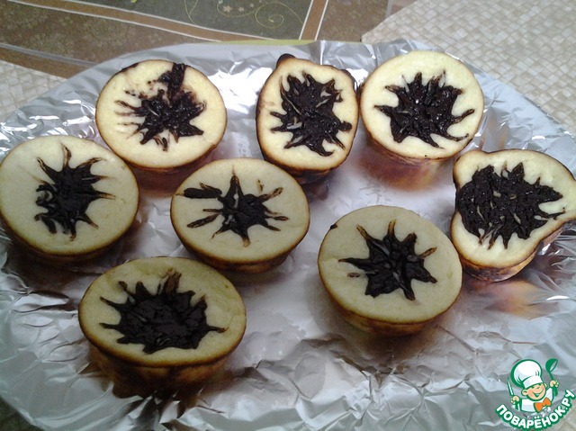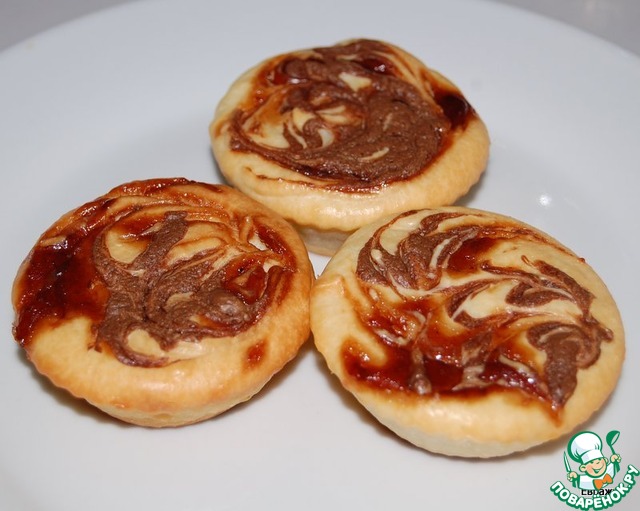 Делаем капли из конфитюра прямо на тесто и рисуем с помощью зубочистки разводы произвольные.