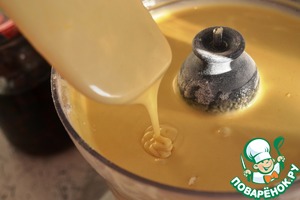 Смешать все жидкие продукты (мед, яйца, растопленное масло, сметану) с сахаром, солью и ванильным сахаром.
