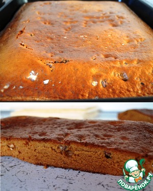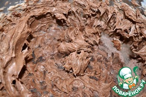 Затем вмешать муку, смешанную с содой, добавить орехи. Вот и все. Тесто получается жидким.