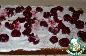 Каждую часть разрезала еще пополам, чтобы лучше пропитались коржи. Смазываем кремом и выкладываем вишни. Вишни у меня консервированные. Помните, я выставляла рецепт консервированной вишни в собственном соку без сахара? Это объедение!!!