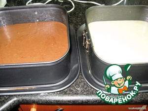 Яйца взбить с сахаром и сметаной, постепенно добавить муку, отделить примерно 1/3 и добавить какао, разлить в смазанные формы.