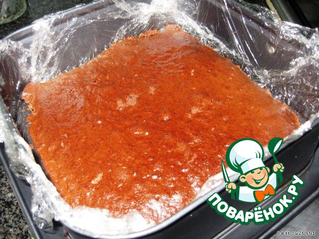 А теперь по рецепту. Бисквит действительно получился самым настоящим, с настоящим бисквитным вкусом. Но, глядя на фото, не совсем разберешься в размерах формы. Поэтому, приготовив две большие квадратные формы для выпечки, оказалось,что они слишком большие для того количества продуктов, которые указаны. :? Мне пришлось срочно переливать тесто в маленькую круглую форму ( хотя в итоге, торт оказался довольно-таки большой). В общем, он получился не квадратным, а круглым. Но в красоте он совсем не потерял.Я залила его шоколадной глазурью так, чтобы бока немного выглядывали, чтобы его содержание интриговало и разжигало любопытство. И еще. Желательно было, конечно написать, какой размер должен быть у кубиков( как мне кажется, я нарезала их слишком крупно и он не пропитался как следует ( хотя, наверное, так и должно было быть). И еще, вместо молока я добавила 15% сливки. Я боялась, что торт будет совсем жидкий. Слишком уж много заливки получилось. В общем, зря я , наверное, опасалась. Вы же написали, что пудинг играет роль загустителя, а я, похоже именно этот момент не учла и побоялась добавить молоко. Но в итоге торт удался. Гости остались довольны, а я, наверное, слишком требовательная к себе. В общем, тортики профессионального кондитера Диана раздавала гостям домой. А моего и не осталось. Рецепт замечательный, совсем несложный в приготовлении, бисквиты можно приготовить за двое суток, пропитать его за сутки а украсить перед торжеством. Иногда экономия времени для нас играет немалое значение. Всем рекомендую.
