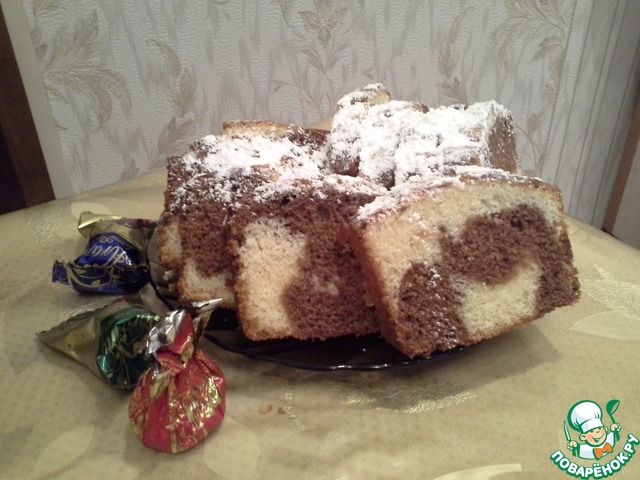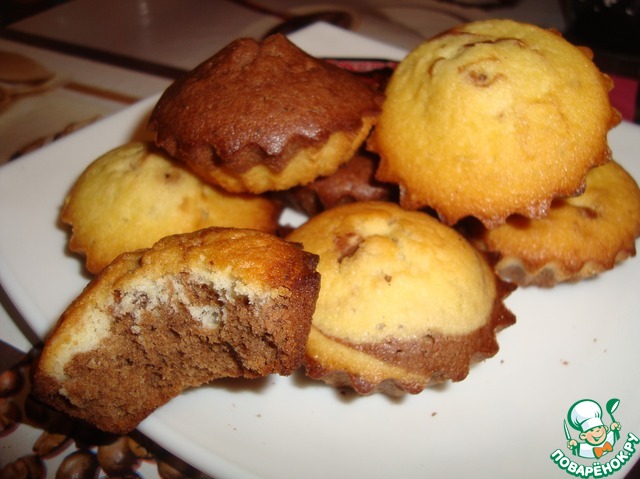 Затем нужно тесто выложить в смазанную форму для кекса - по ложке светлого и темного теста, чередуя слои.