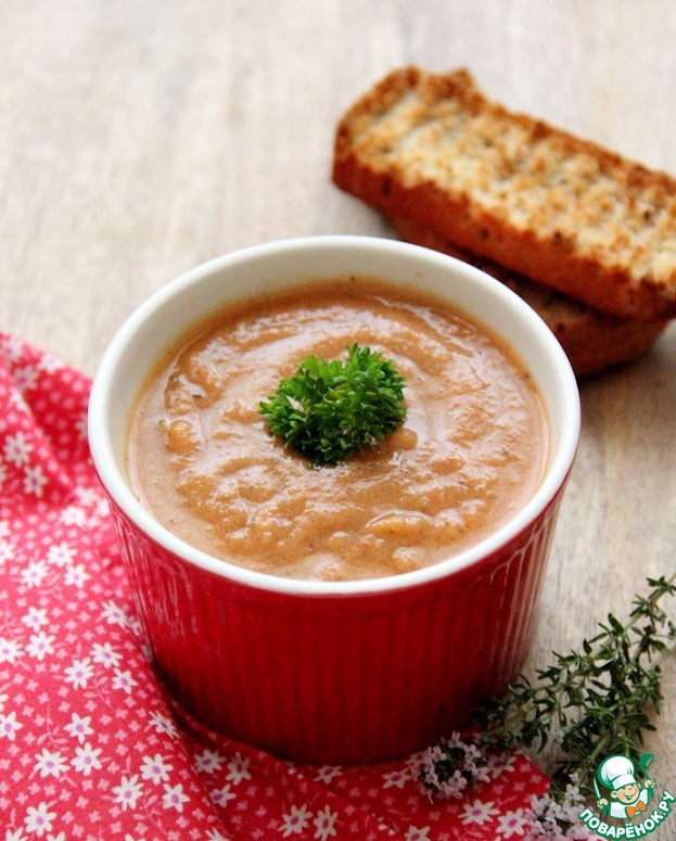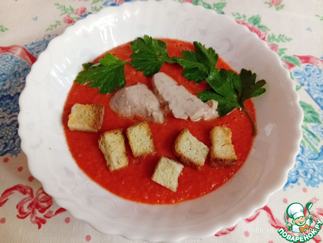 Измельчить все в блендере до однородности. Если получается слишком густо, добавить немного оливкового масла и овощного или куриного бульона, но мне не понадобилось. Попробовать на вкус, добавить соли, перца и бальзамического уксуса или лимонного сока по вкусу. Хорошо перемешать вилкой, чтобы убрать пузырьки воздуха. Поставить в холодильник минимум на 30 минут. Гаспаччо вкусный холодным, это важно! Пару ломтиков багета подсушить в духовке до состояния гренок.