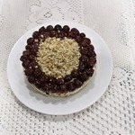 Через 2-3 часа перевернуть торт на плоскую тарелку и украсить тертым шоколадом и вишней.