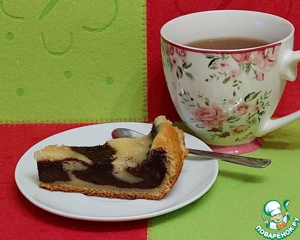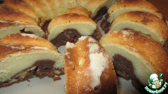В форму перекладываем светлое тесто. Сверху на него выкладываем шоколадно-кофейное тесто.