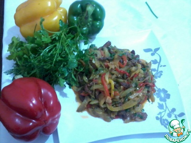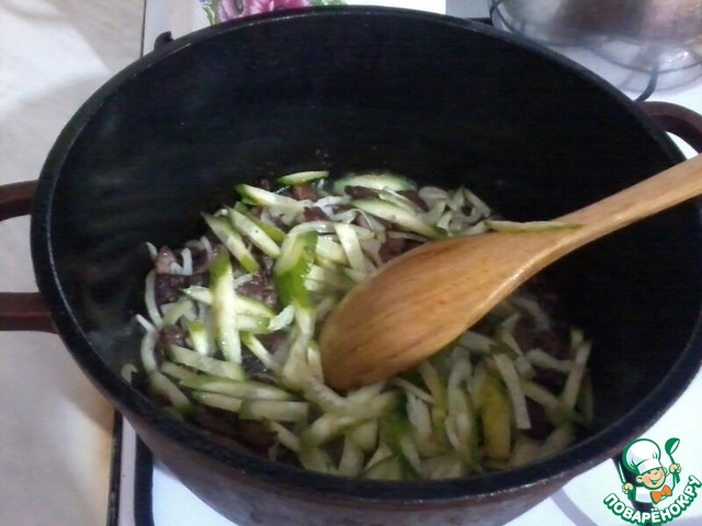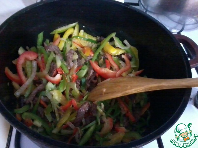 Овощи класть в следующем порядке: лук, перемешивая, жарить вместе с мясом 1-2 минуты...