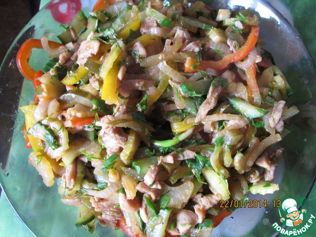 Мясо, овощи порезать тонкой соломкой заранее, т. к. при приготовлении салата времени не будет. Чеснок - через чеснокодавку.
