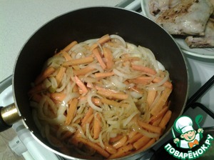 Бедрышки подрумянились, пока достаем их из сотейника, а вместо них, в то же масло, загружаем наши подготовленные морковочку и лучок. Пассeруем.